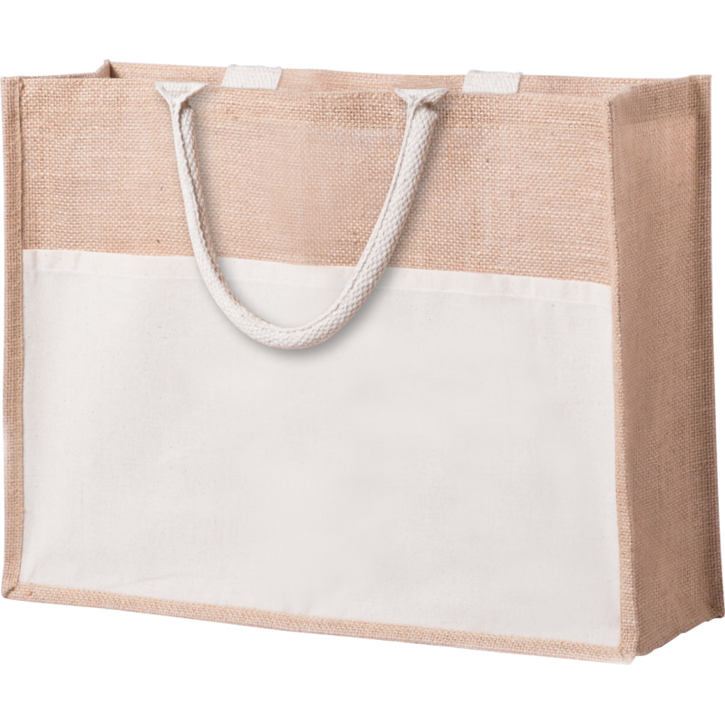 Sac de plage en jute laminée. Anses en coton. Poche frontale.