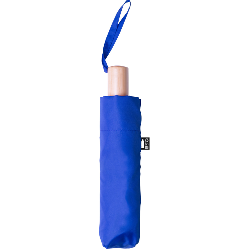 Parapluie manuel pliable 8 panneaux avec housse de couleur assortie. Cadre en métal, baleines en fibre de verre et manche en bois. En RPET 190T et labélisé RPET.