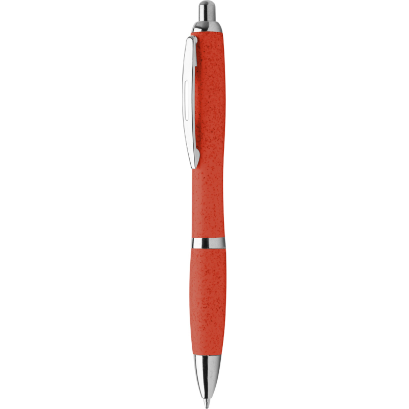 Stylo bille plastique et en paille de blé écologique avec attributs chromes. Encre bleue.