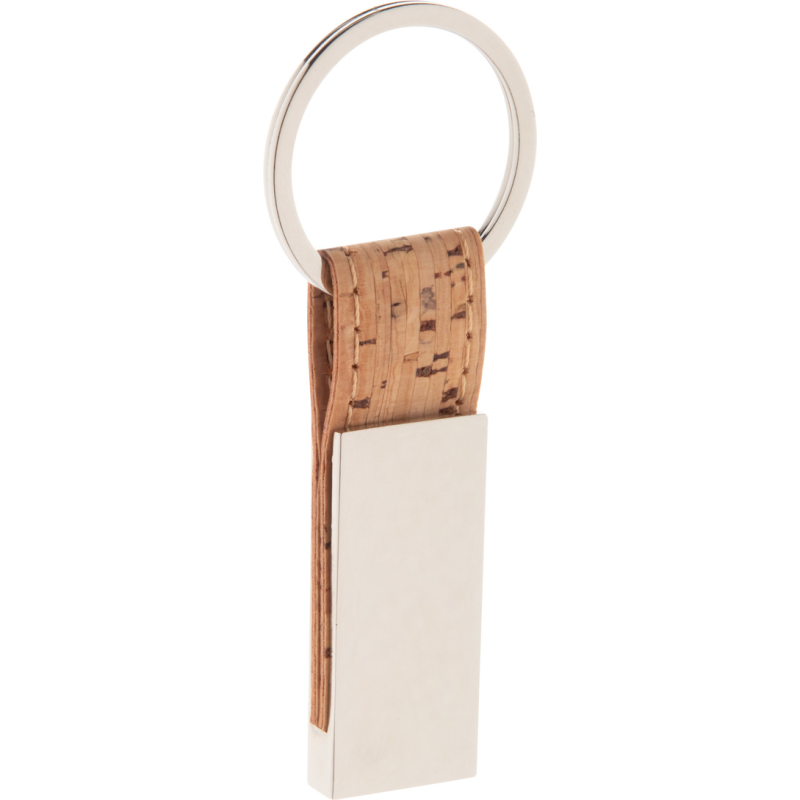 Porte-clés rectangulaire en métal et liège. Lanière en PU. Dans une boîte en papier kraft.