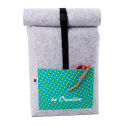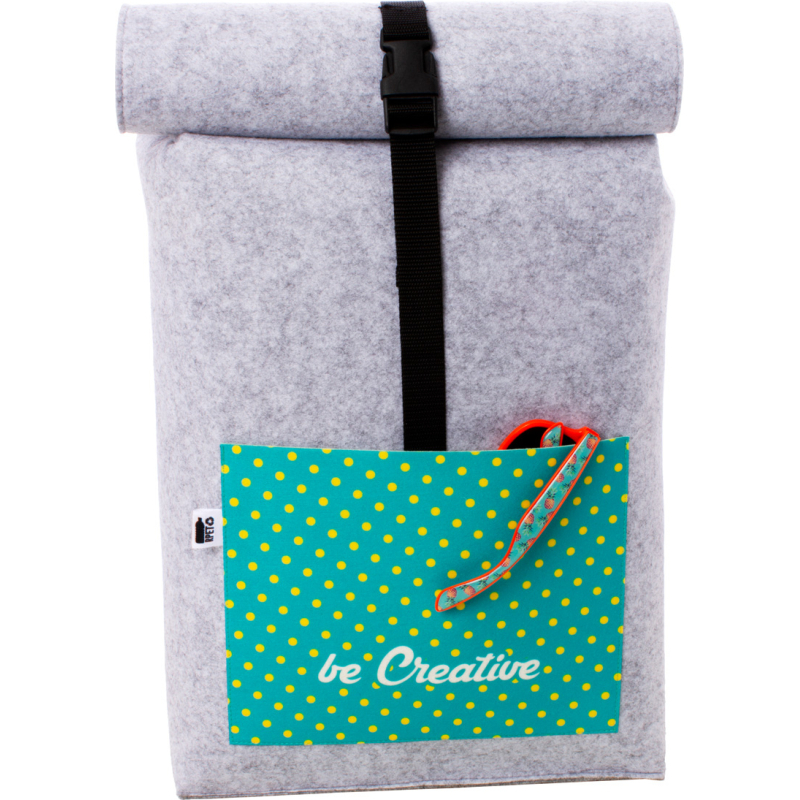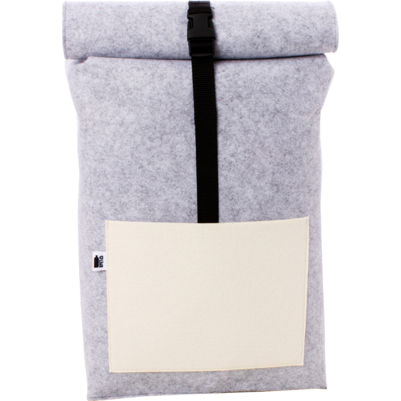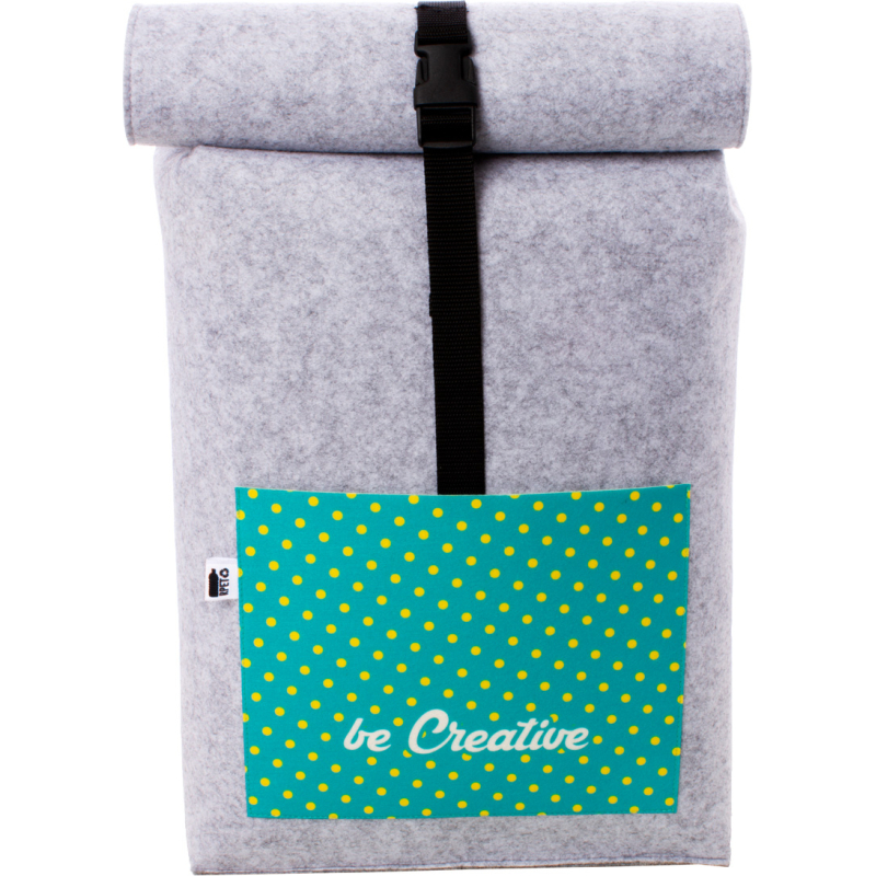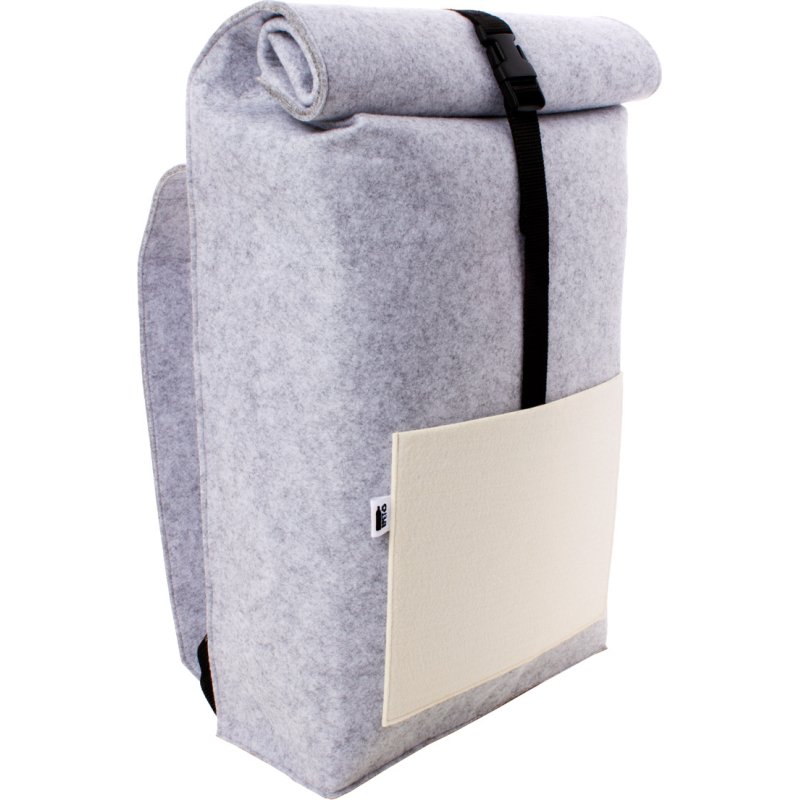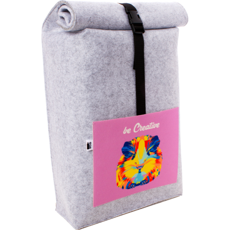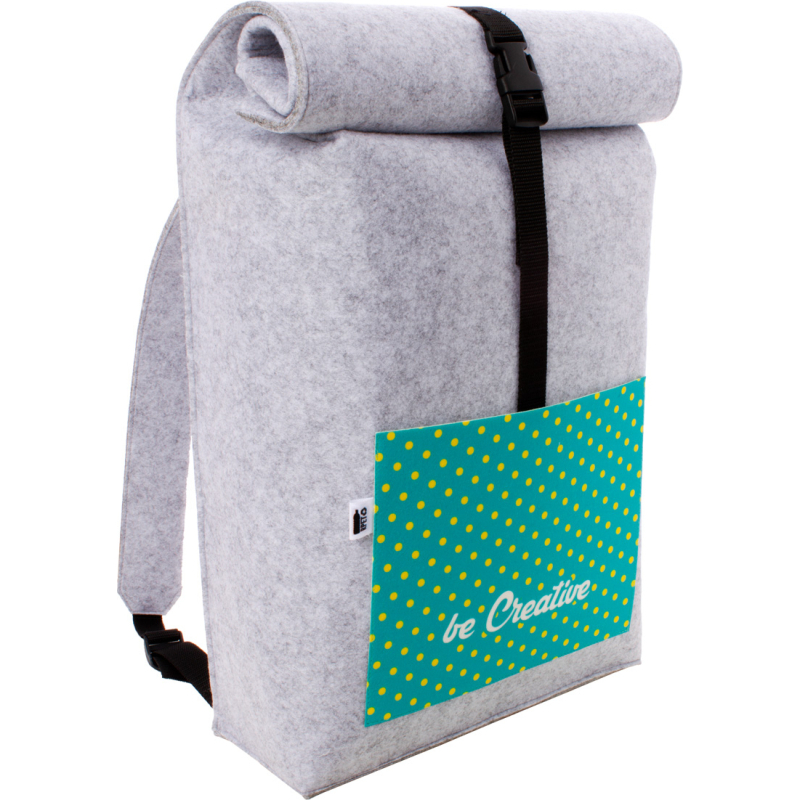 Sac à dos roulé sur mesure en feutre RPET avec un compartiment et une poche avant impression en quadri. Labélisé RPET. Le prix comprend l'impression en sublimation. Quantité minimale : 50 pièces.