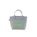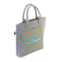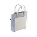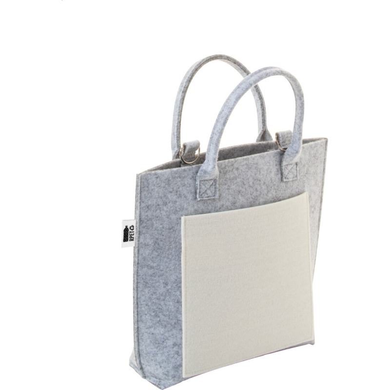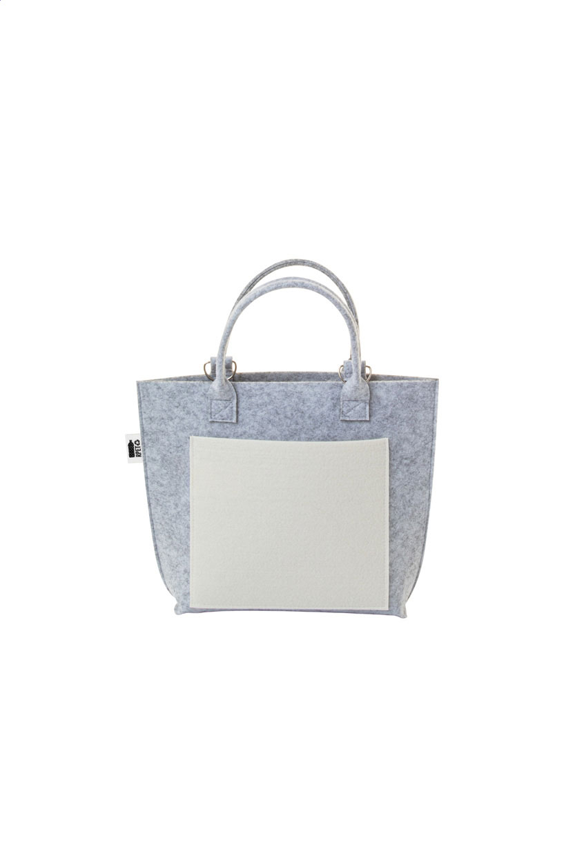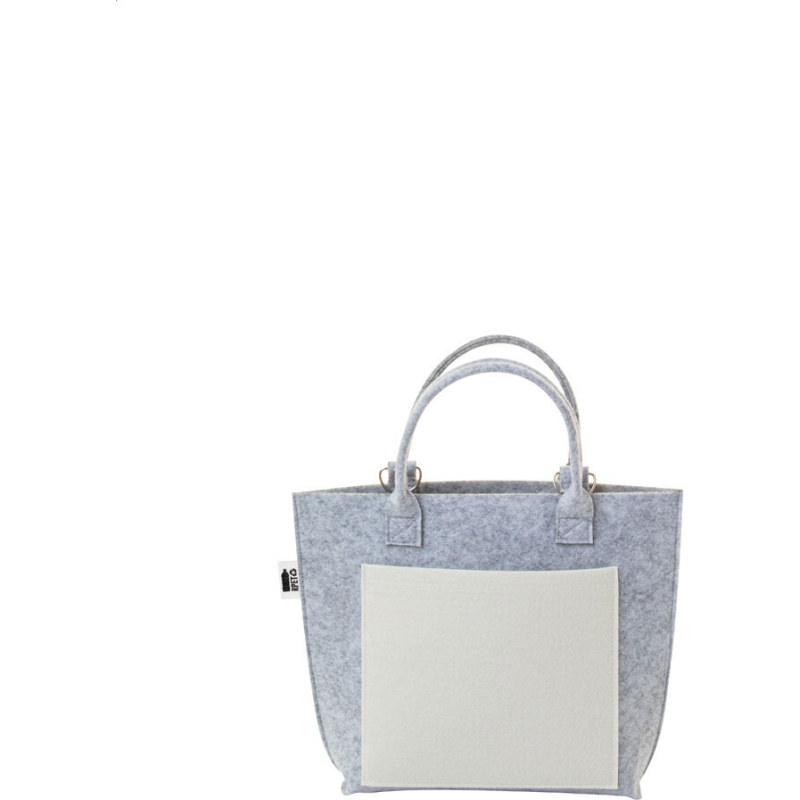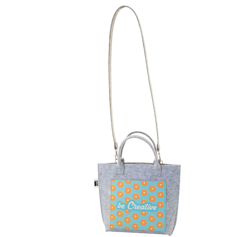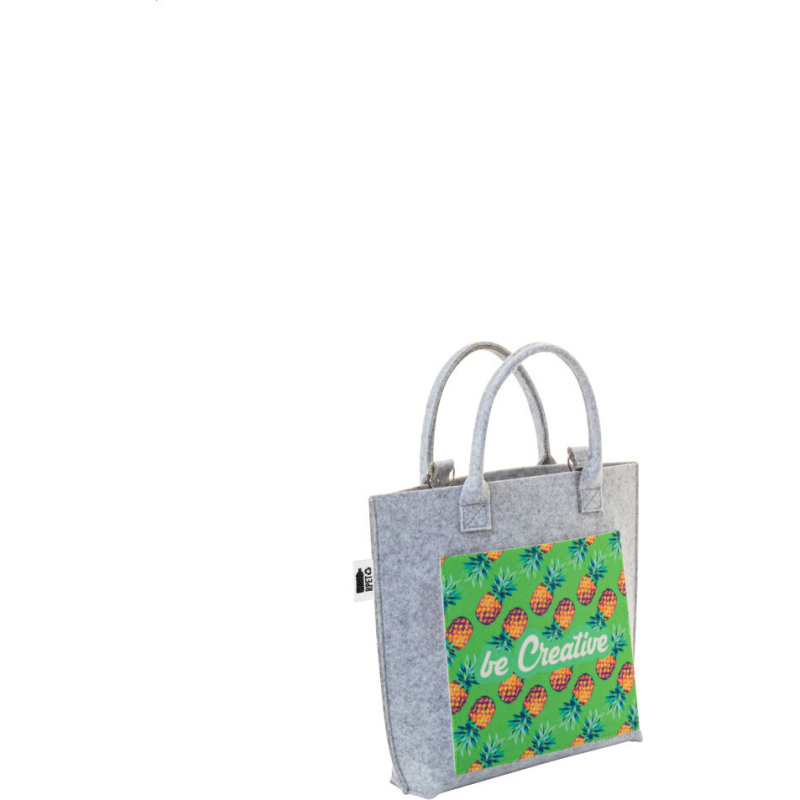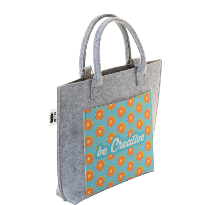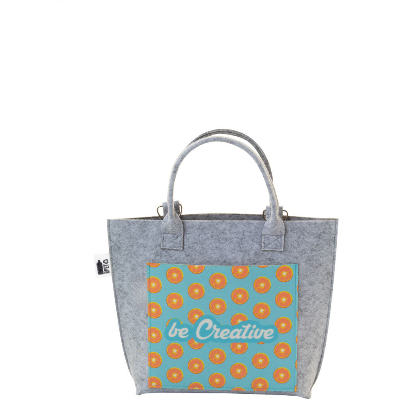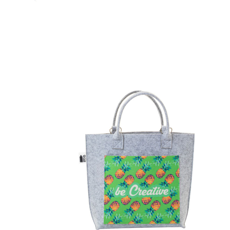 Sac en feutre RPET pour femmes, personnalisable avec poche frontale imprimée en couleur. Poignées courtes, bandoulière amovible et étiquette RPET distinctive. Le prix comprend l'impression par sublimation. Quantité minimale: 50 pièces.
