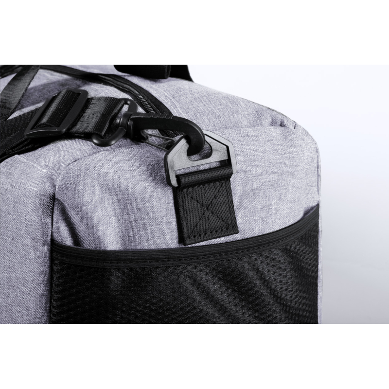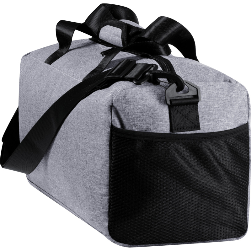 Sac de sport avec compartiment zippé, poches latérales filet et bandoulière réglable, polyester 600D.