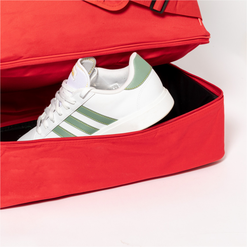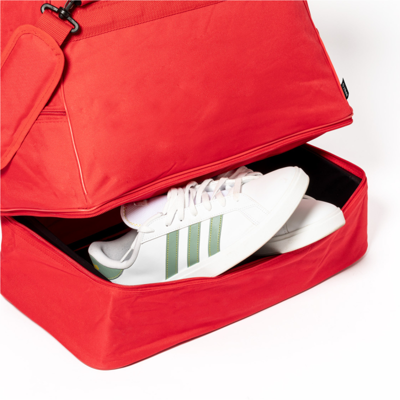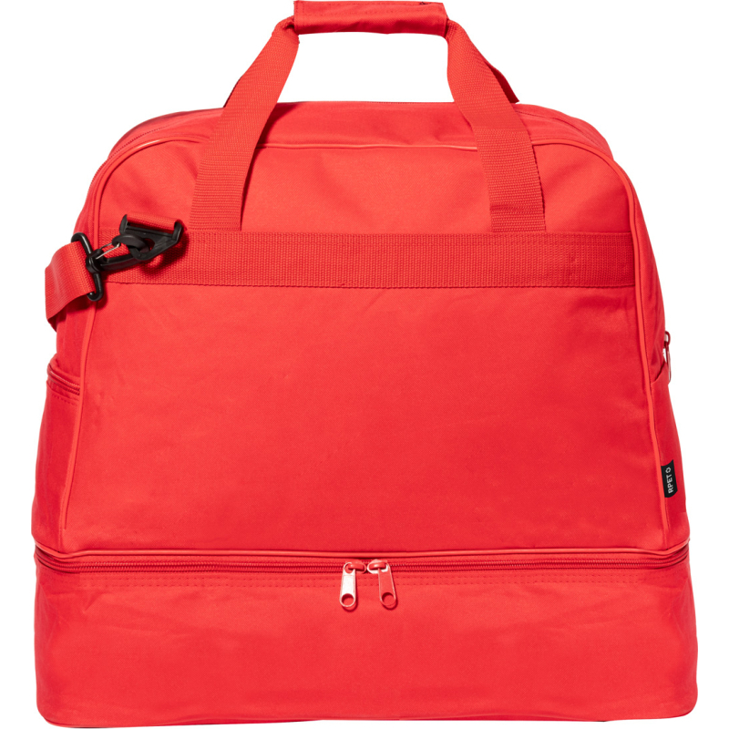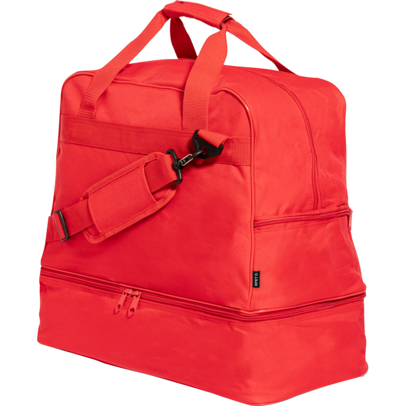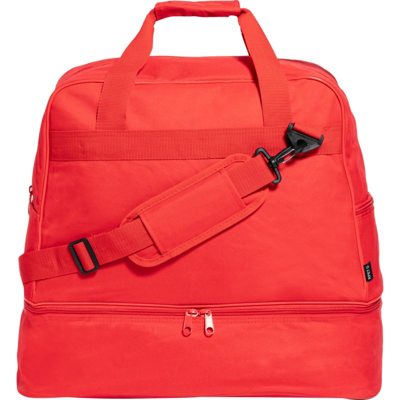 Sac de sport en RPET avec compartiments zippés, compartiment à chaussures et bandoulière réglable. Polyester RPET 600D, labélisé RPET.