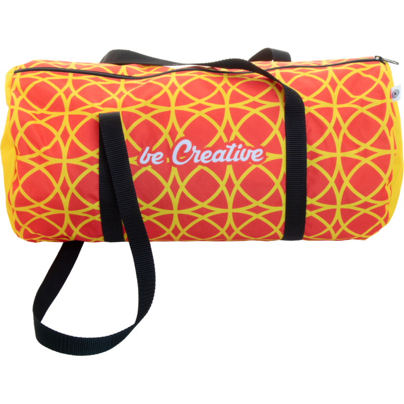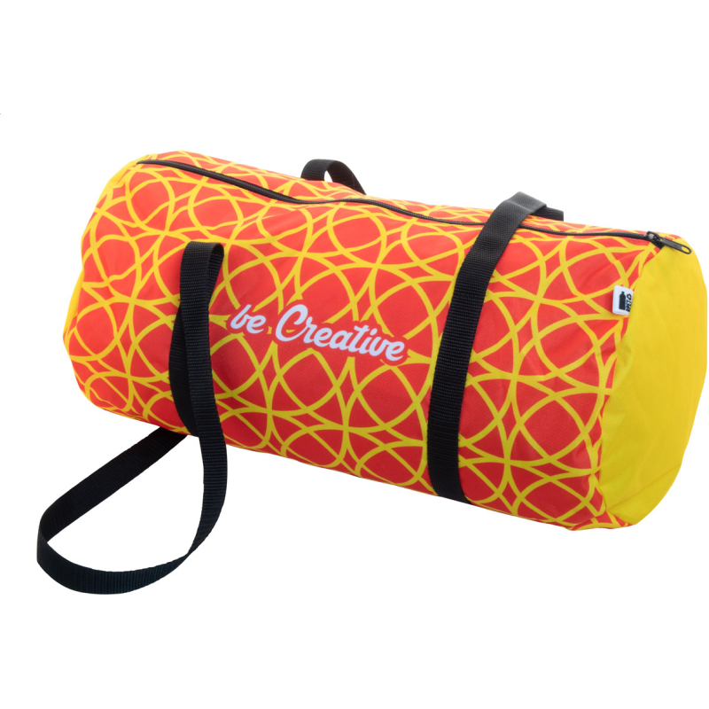 Sac de sport zippé sur mesure en polyester RPET 600D avec anses longues. Impression en sublimation et labélisé RPET. Quantité minimale : 50 pièces.