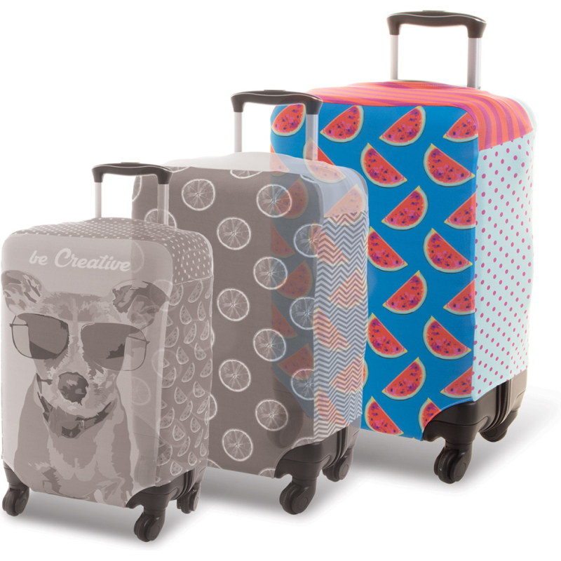 Housse à bagages en polyester, sur mesure, avec fermeture velcro. Convient aux valises de grande taille jusqu'à 50x70x30 cm. Avec des graphismes en sublimation sur toute la surface. Quantité minimale de commande : 50 pièces.