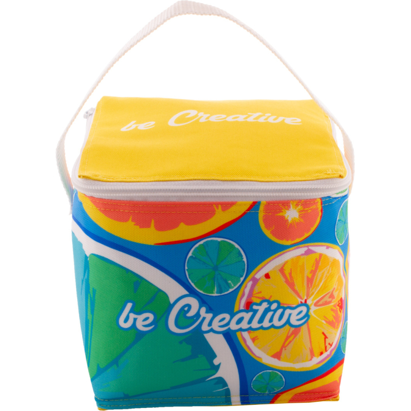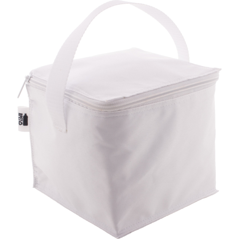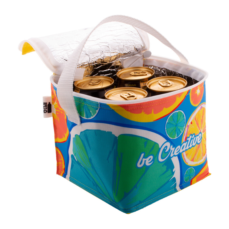 Sac isotherme zippé sur mesure en polyester RPET 600D doublé en aluminium et pour 4 cannettes 0,33 L. Impression en sublimation sur toute la surface et labélisé RPET. Quantité minimale : 50 pièces.