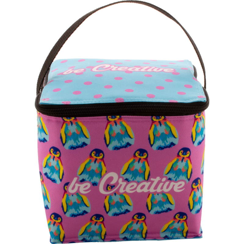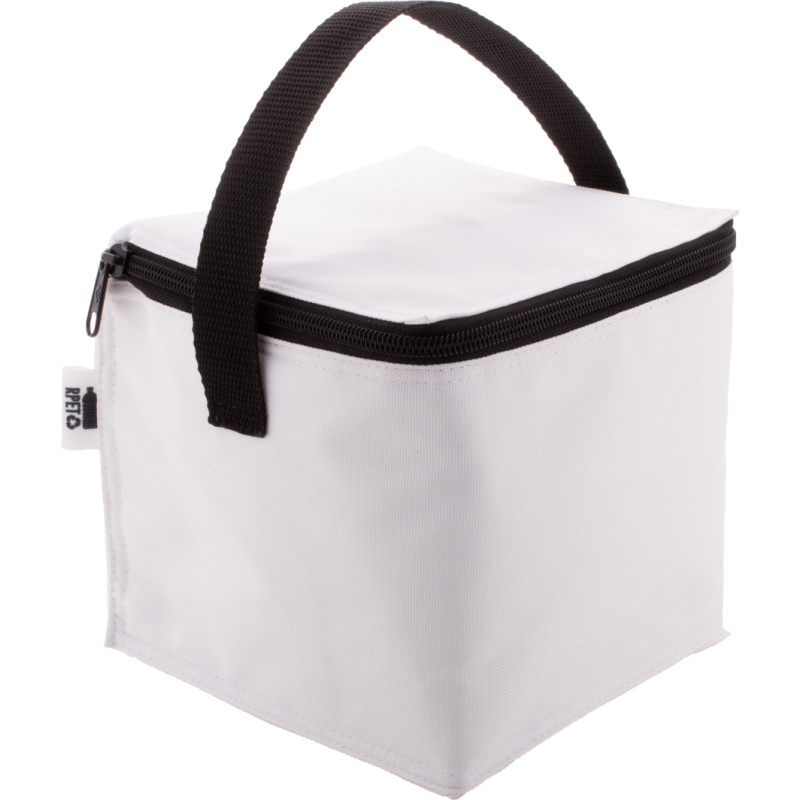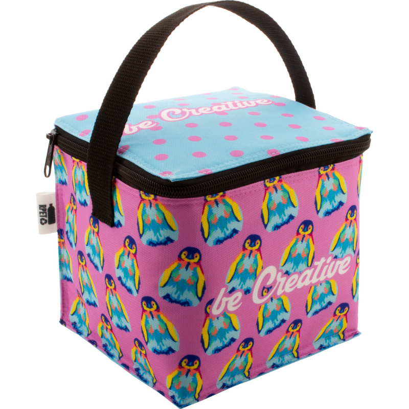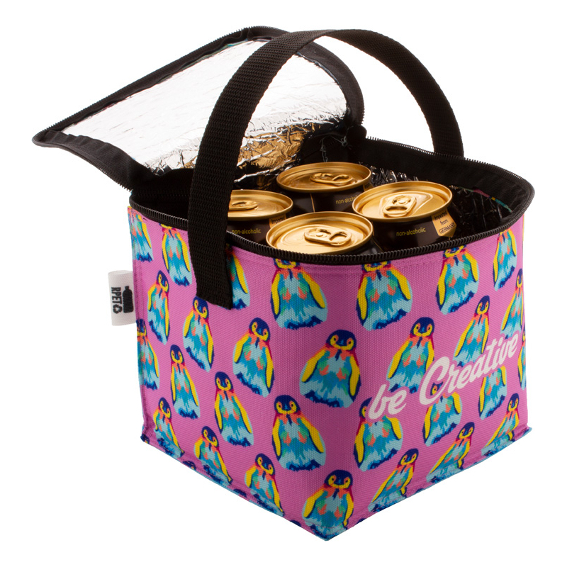 Sac isotherme zippé sur mesure en polyester RPET 600D doublé en aluminium et pour 4 cannettes 0,33 L. Impression en sublimation sur toute la surface et labélisé RPET. Quantité minimale : 50 pièces.