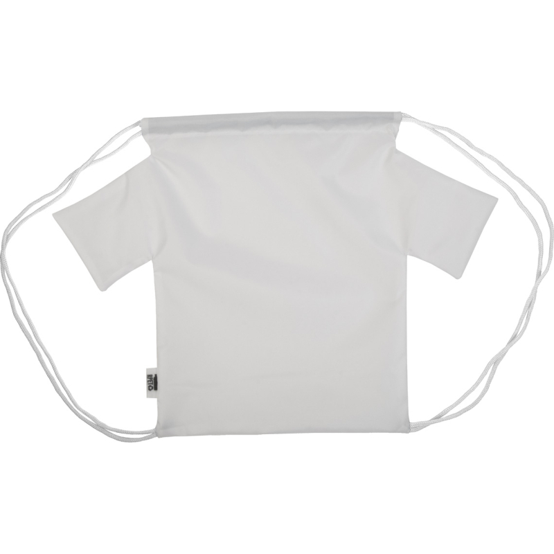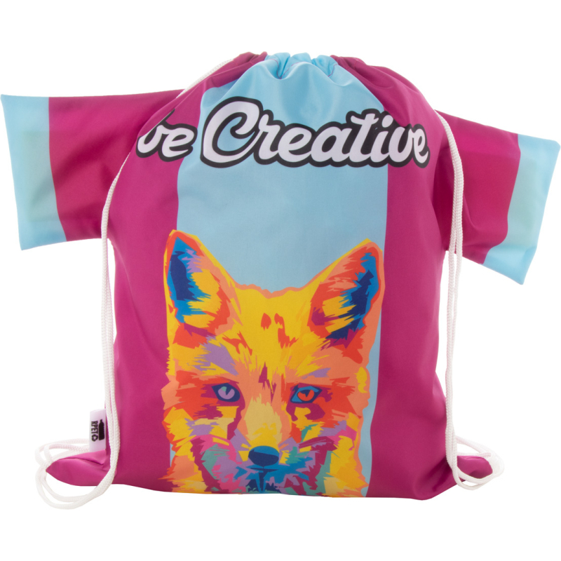 Sac piscine sur mesure en forme de T-shirt avec cordons colorés, polyester RPET 190T. Impression en sublimation sur toute la surface et labélisé RPET. Quantité minimale : 50 pièces.