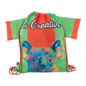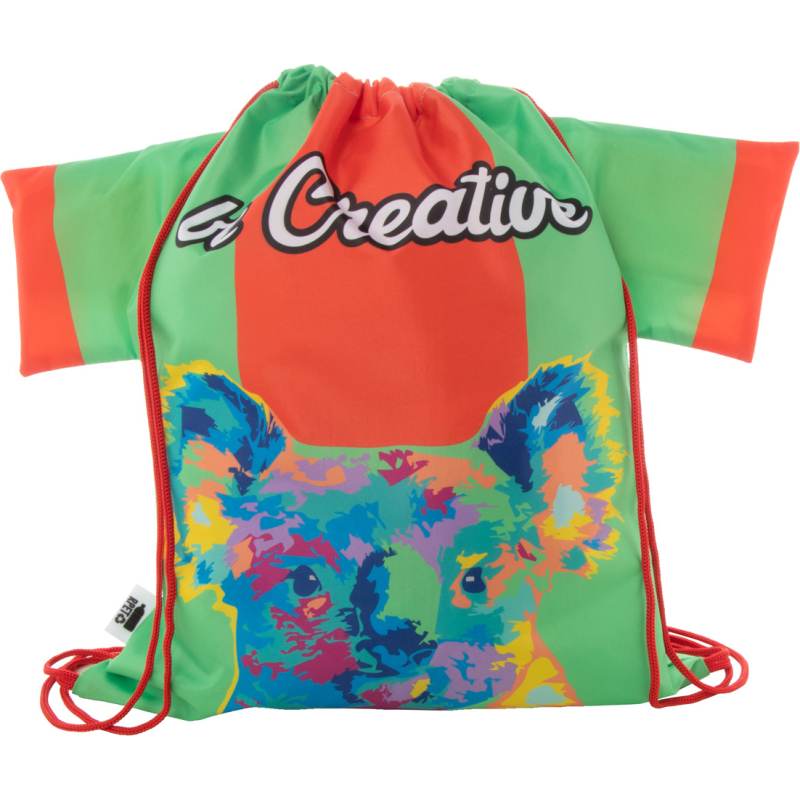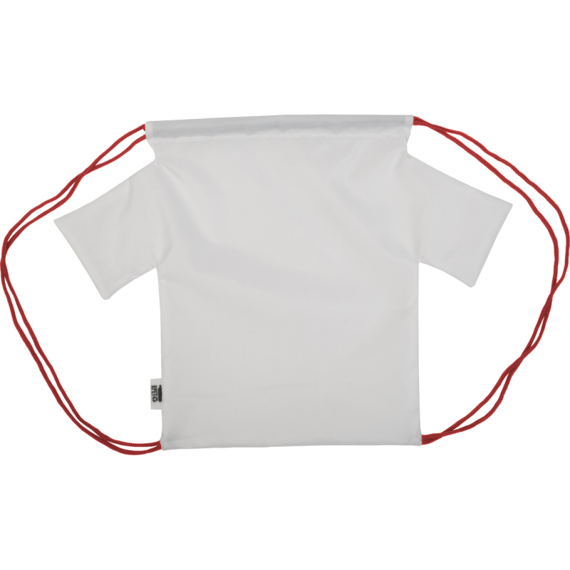Sac piscine sur mesure en forme de T-shirt avec cordons colorés, polyester RPET 190T. Impression en sublimation sur toute la surface et labélisé RPET. Quantité minimale : 50 pièces.
