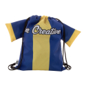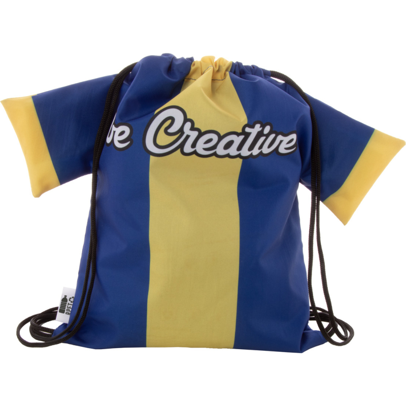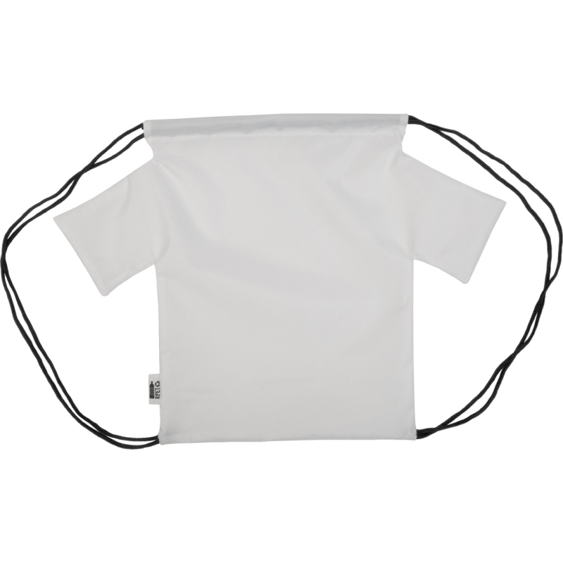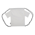 Sac enfant sur mesure en forme de T-shirt avec cordons colorés, polyester RPET 190T. Impression en sublimation sur toute la surface et labélisé RPET. Quantité minimale : 50 pièces.