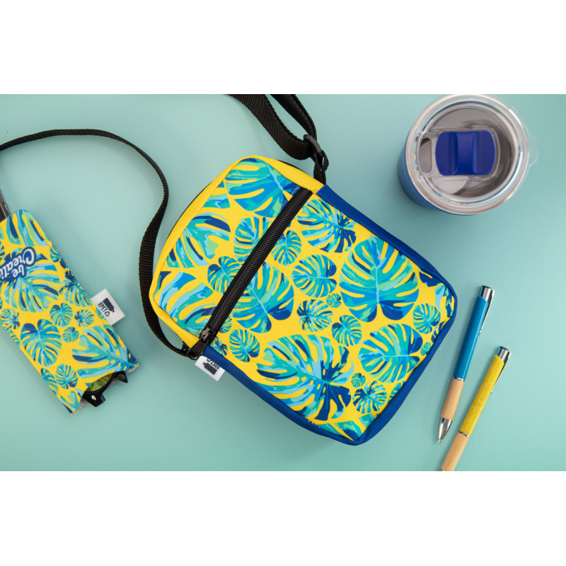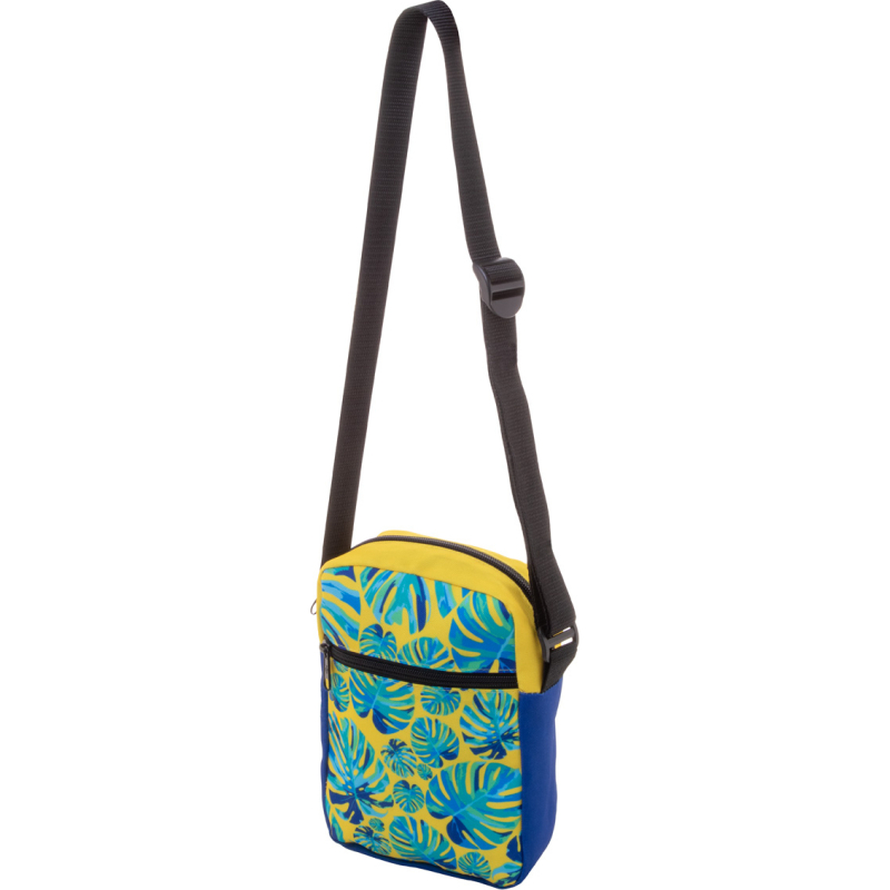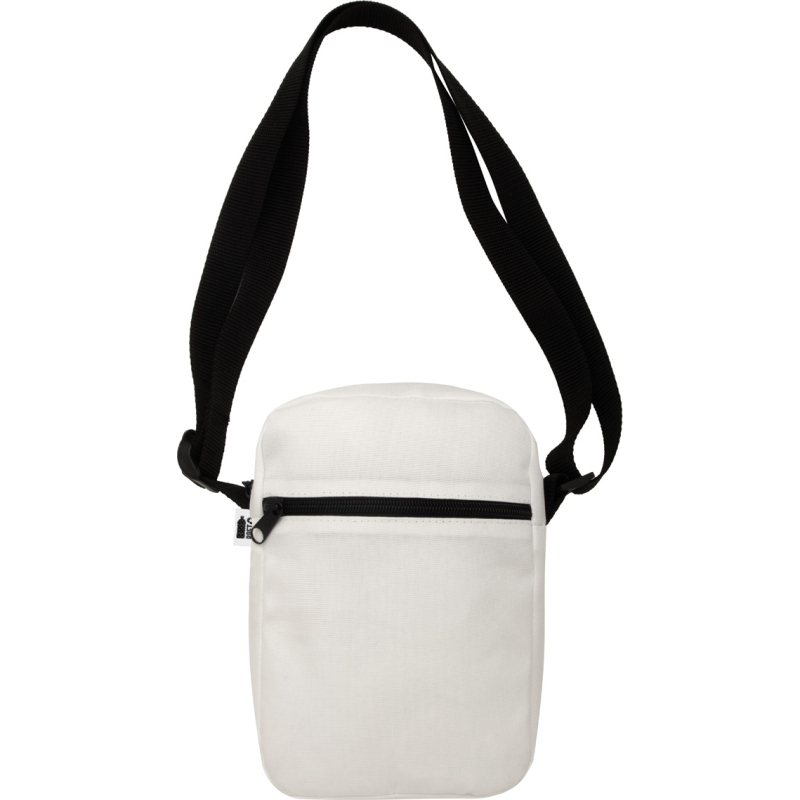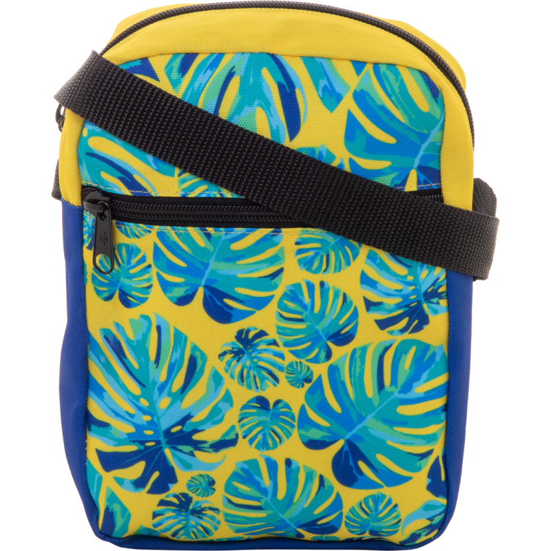 Sac à bandoulière en polyester 600D RPET sur mesure, avec compartiment zippé et poche frontale. Impression en sublimation sur toute la surface et labélisé RPET. Quantité minimale : 50 pièces.