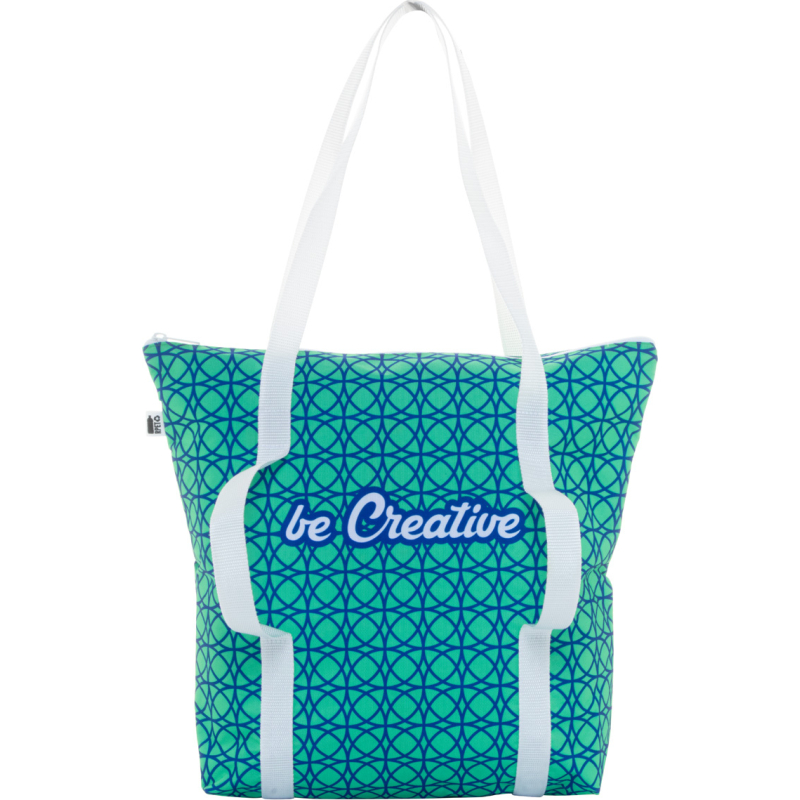 Sac bandoulière zippé sur mesure en polyester 600D RPET avec sangles de support pour tapis de yoga et anses longues. Impression en sublimation sur toute la surface et labélisé RPET. Quantité minimale : 50 pièces.