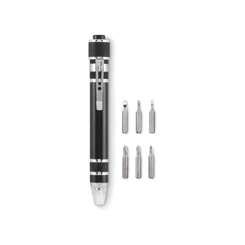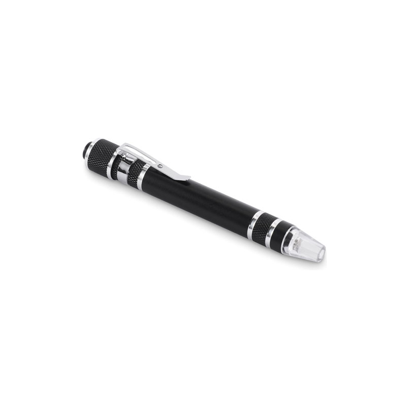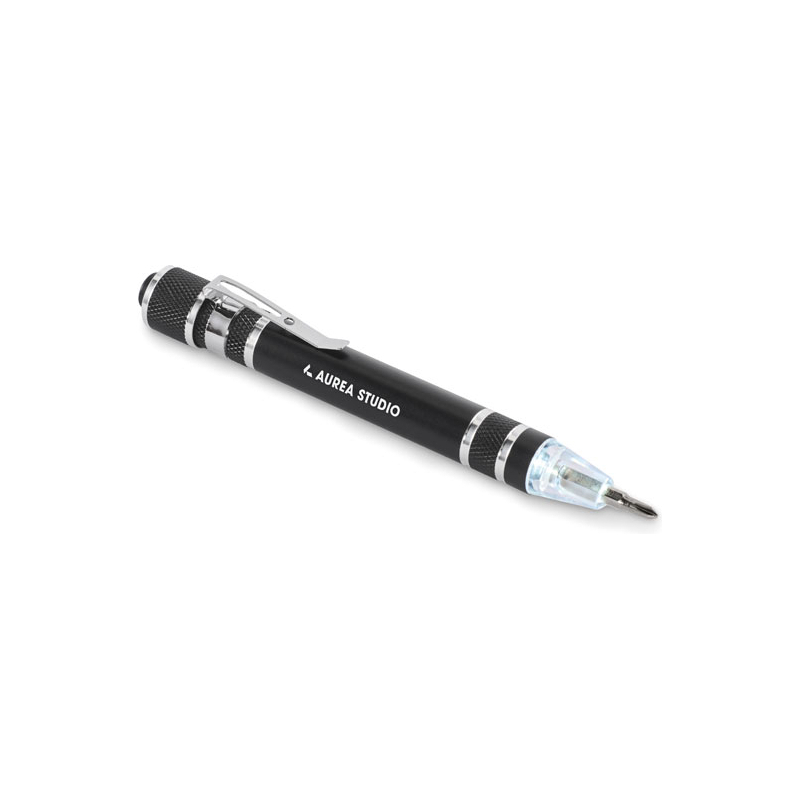 Outil multifonction en aluminium recyclé en forme de stylo avec lampe. Comprend 3 têtes de tournevis plats et 3 têtes de tournevis cruciformes. 4 piles bouton LR41 incluses.
