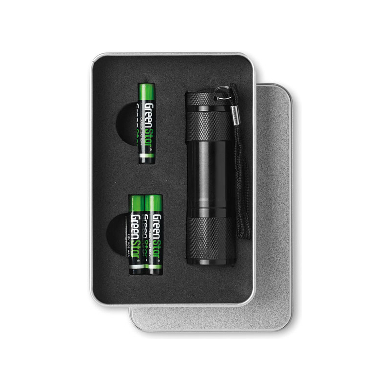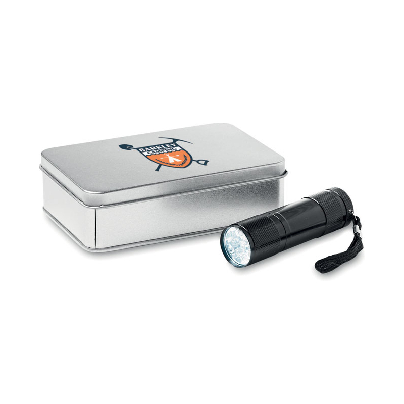 Torche aluminium 9 LED. 3 piles AAA et dragonne incluses. Présentée dans une boite métallique.