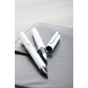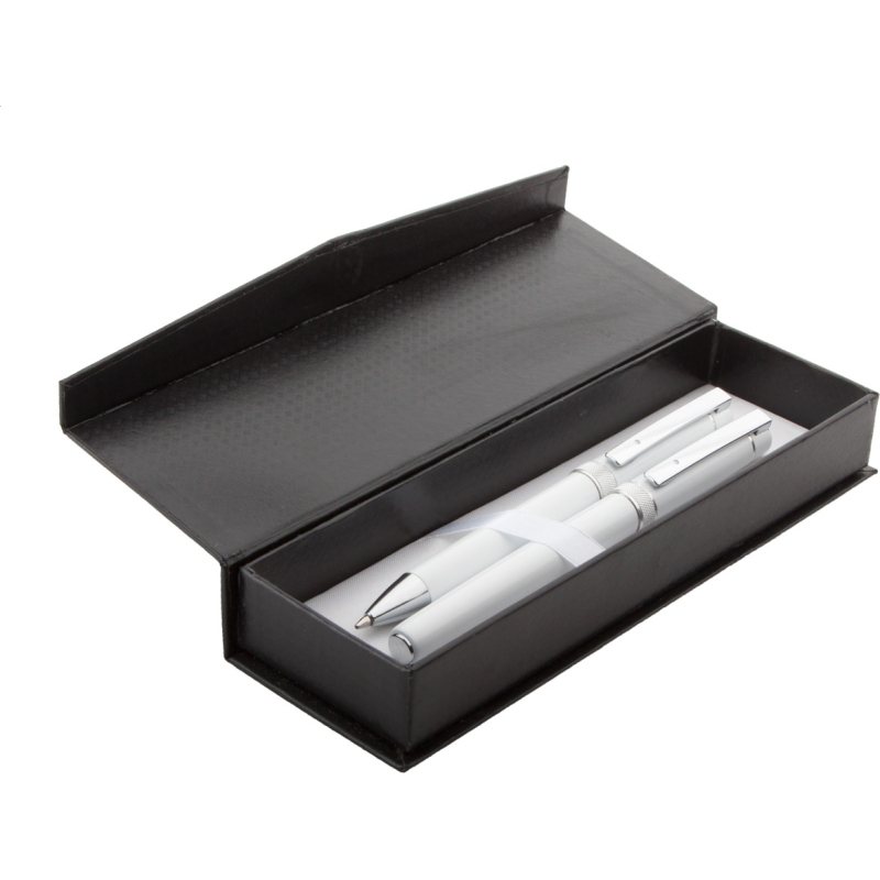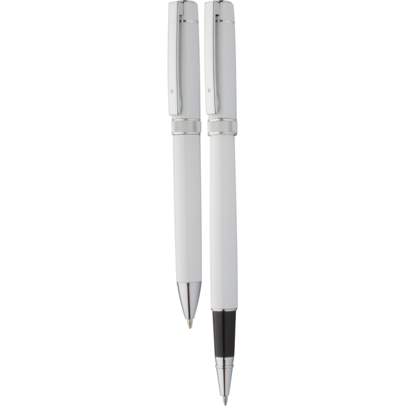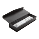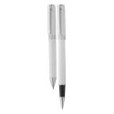 Set stylo à bille et roller en aluminium avec corps brillant et finition aluminium. Livré dans une boîte cadeau noire. Encre bleue.