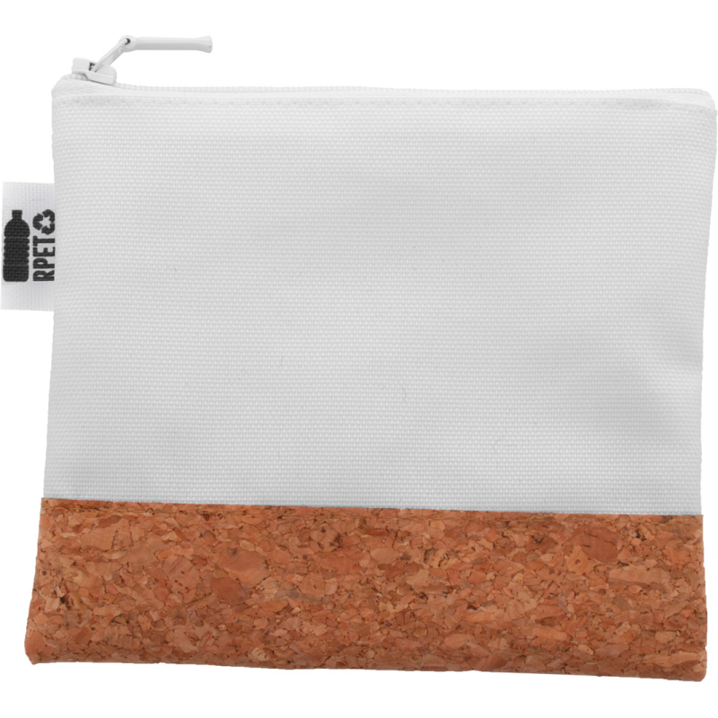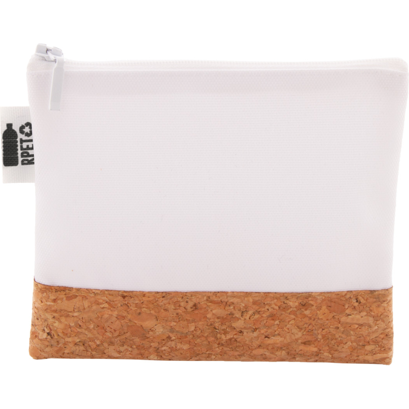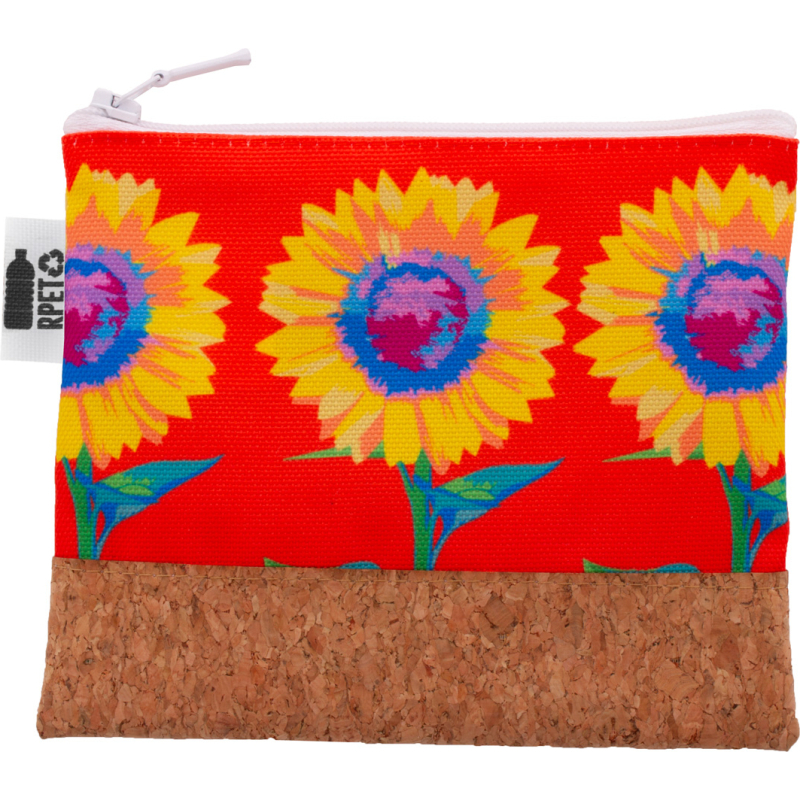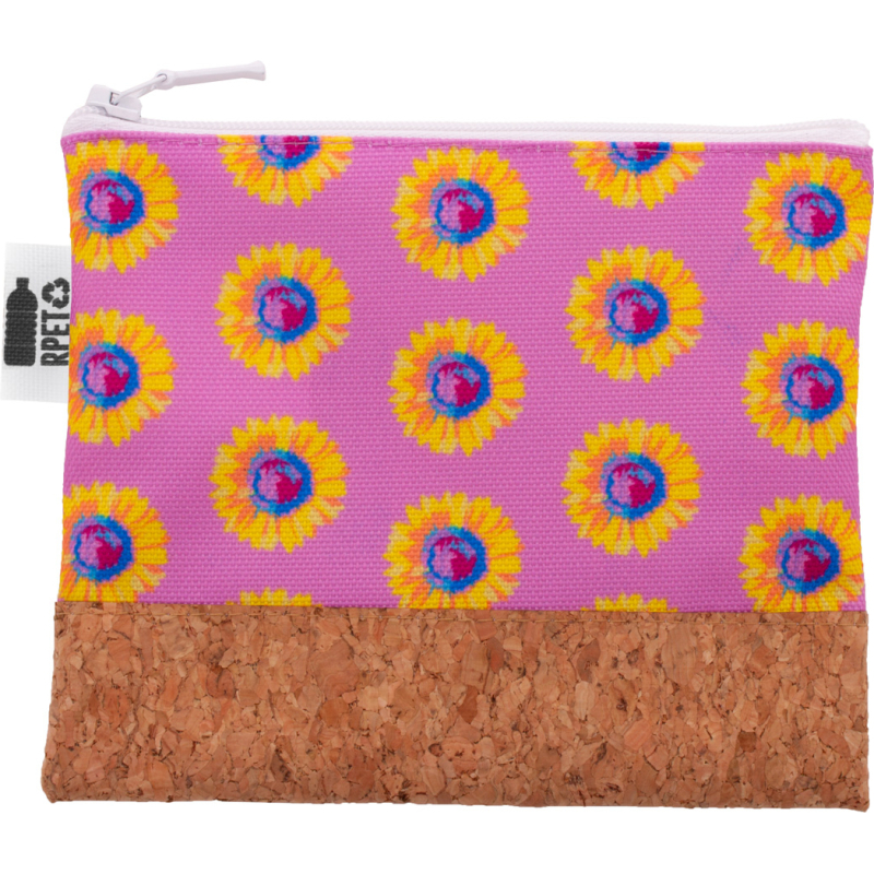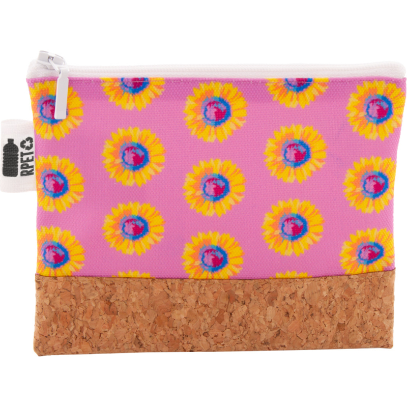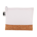 Trousse de maquillage zippée sur mesure en polyester RPET 600D et liège naturel. Impression en sublimation sur toute la surface. Quantité minimale: 50 pièces.