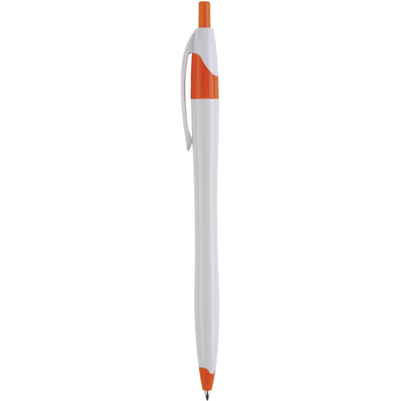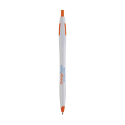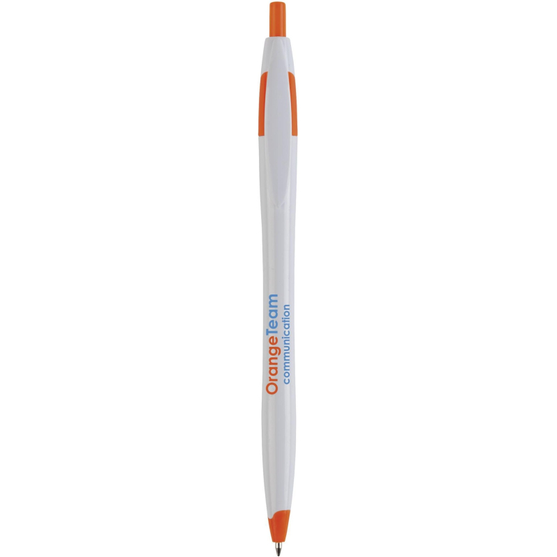 Stylo promotionnel à encre bleue, avec corps élancé et accents colorés.