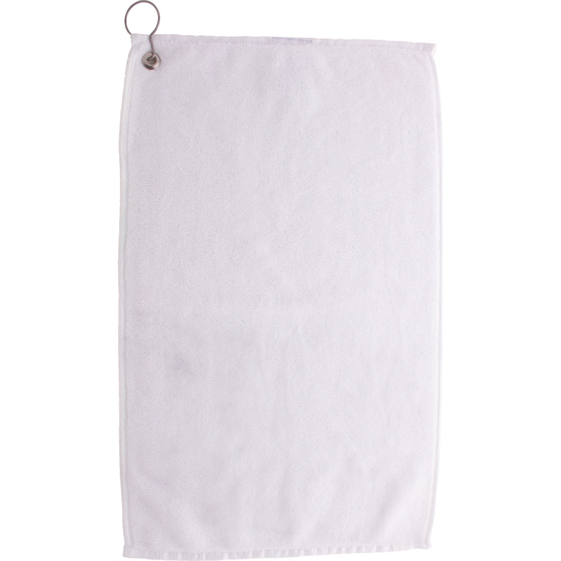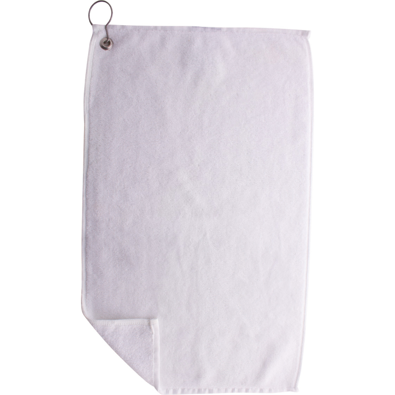 Serviette de golf double face avec cintre en métal et impression en sublimation sur un côté. 100% coton + 100% microfibre, 400 g/m². Le prix comprend l'impression en sublimation. Quantité minimale : 50 pièces.