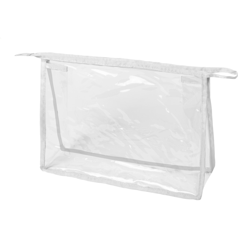 Trousse à maquillage zippée en plastique transparent.