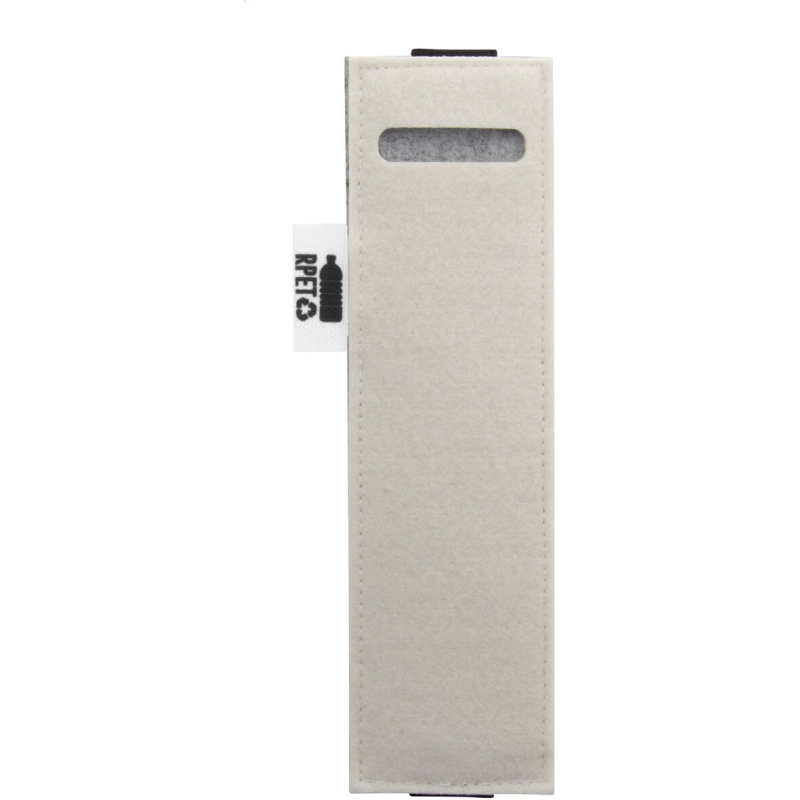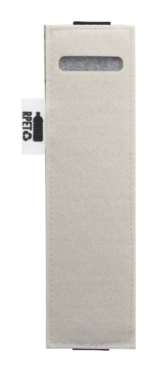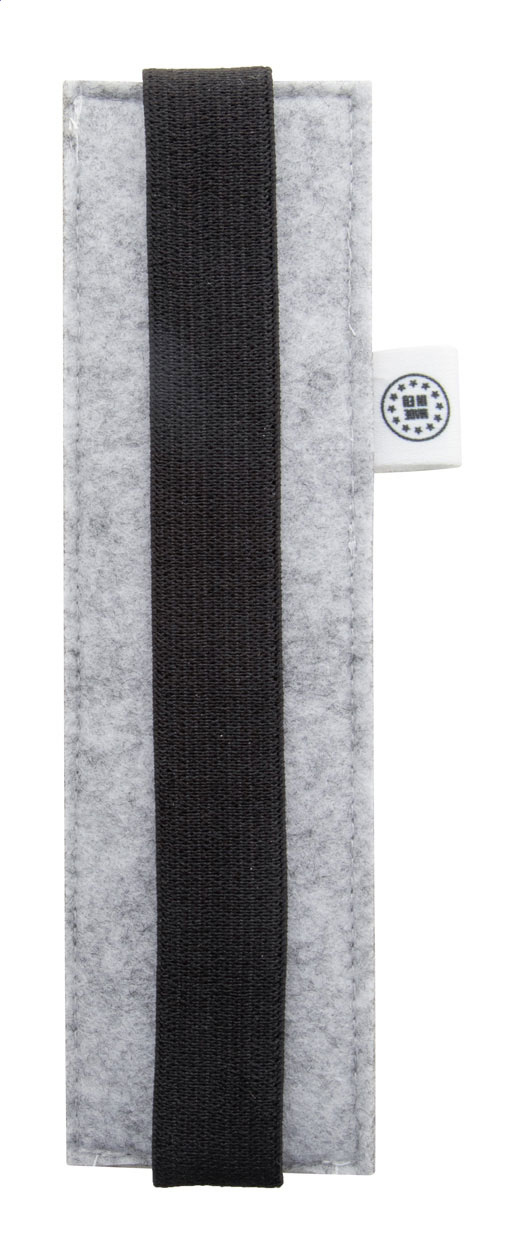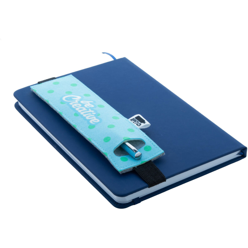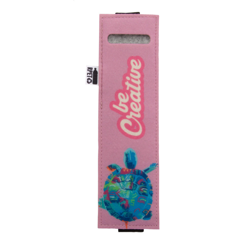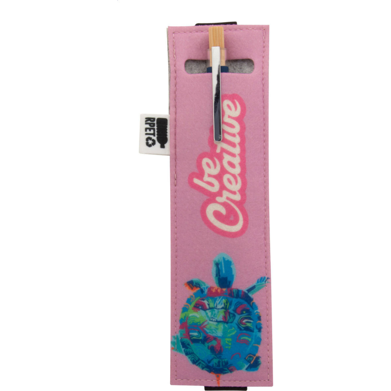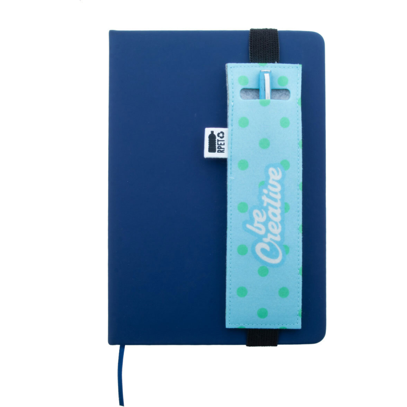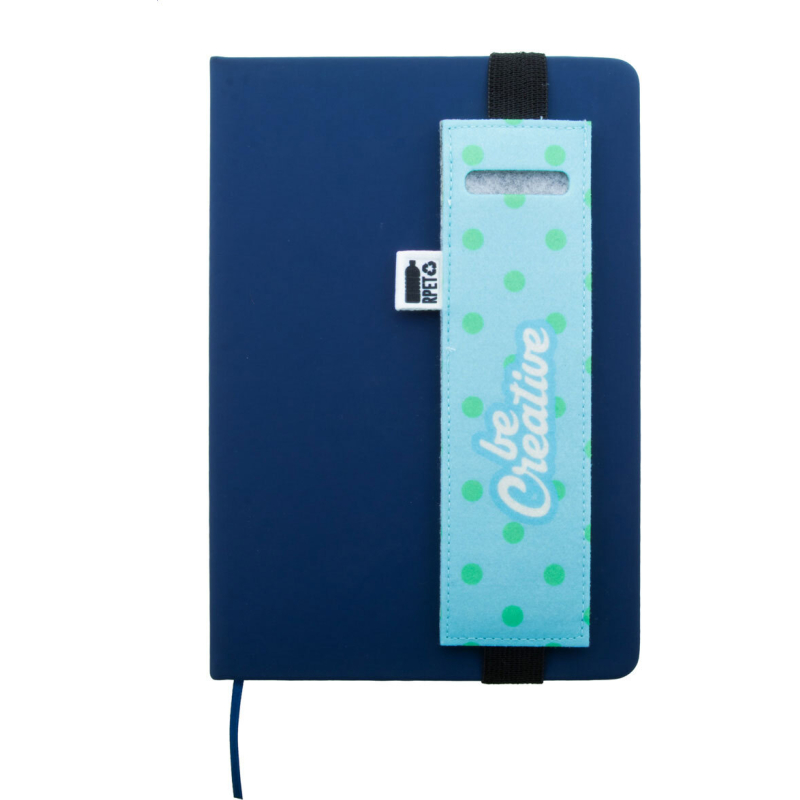Étui en RPET pour stylos-feutres avec face avant impression en quadri et élastique pour le fixer à la couverture d'un cahier. Labélisée RPET. Le prix comprend l'impression en sublimation. Quantité minimale : 50 pièces.